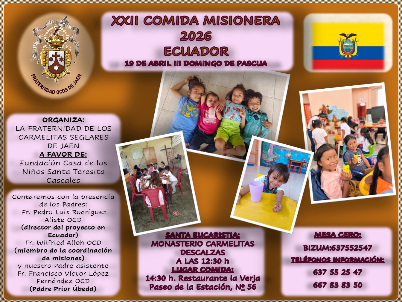 El Carmelo Seglar de Jaén (OCDS) celebrará el próximo 19 de abril, III Domingo de Pascua, su tradicional Comida Misionera, que este año alcanza su vigésimo segunda edición, con el objetivo de apoyar la labor que los Carmelitas Descalzos desarrollan en Ecuador.
