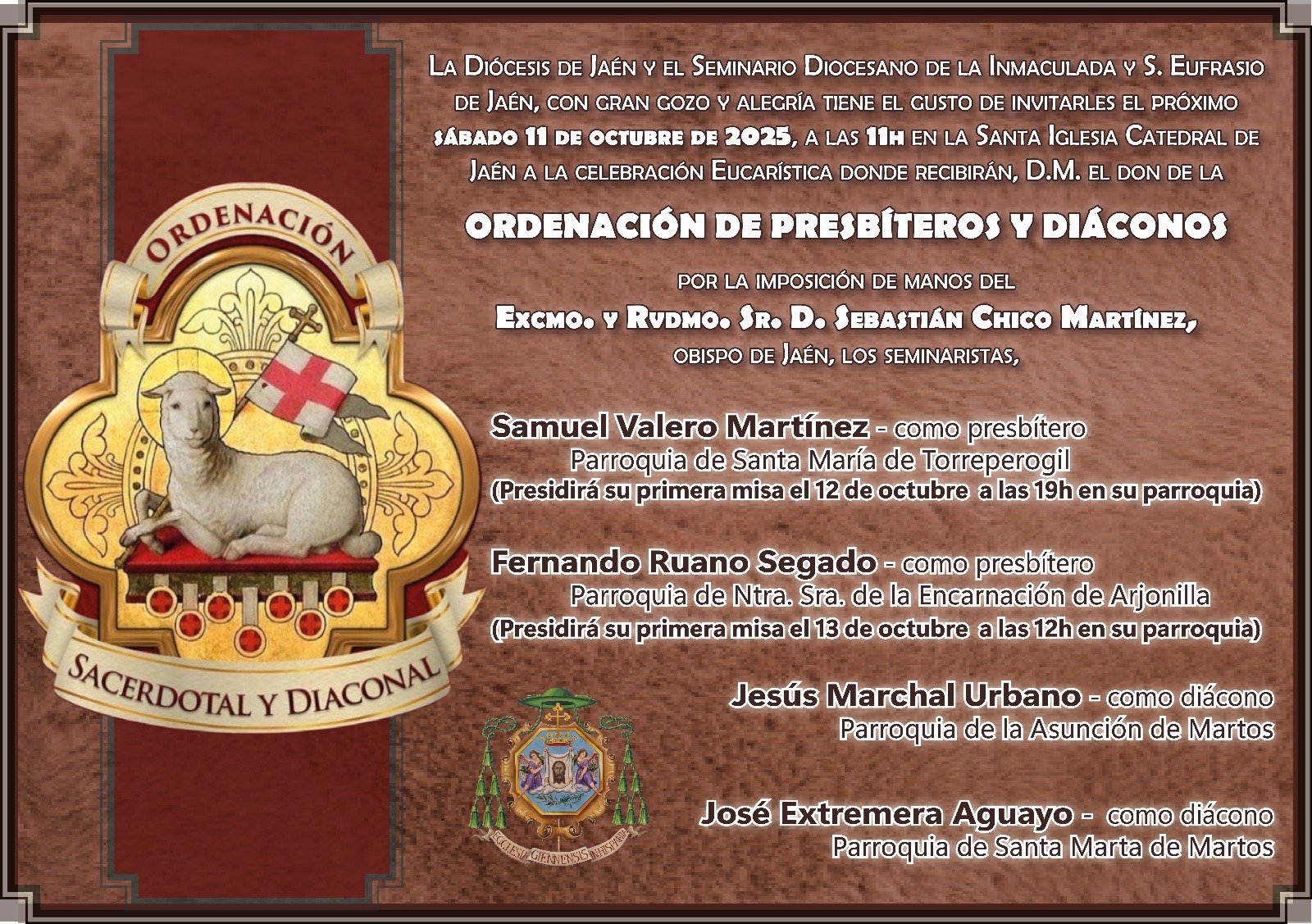 La Iglesia de Jaén anuncia, con gozo, la ordenación presbiteral y diaconal de 4 jóvenes jiennenses. Una celebración solemne, que tendrá lugar en la Catedral de Jaén, el próximo 11 de octubre a las 11 horas.