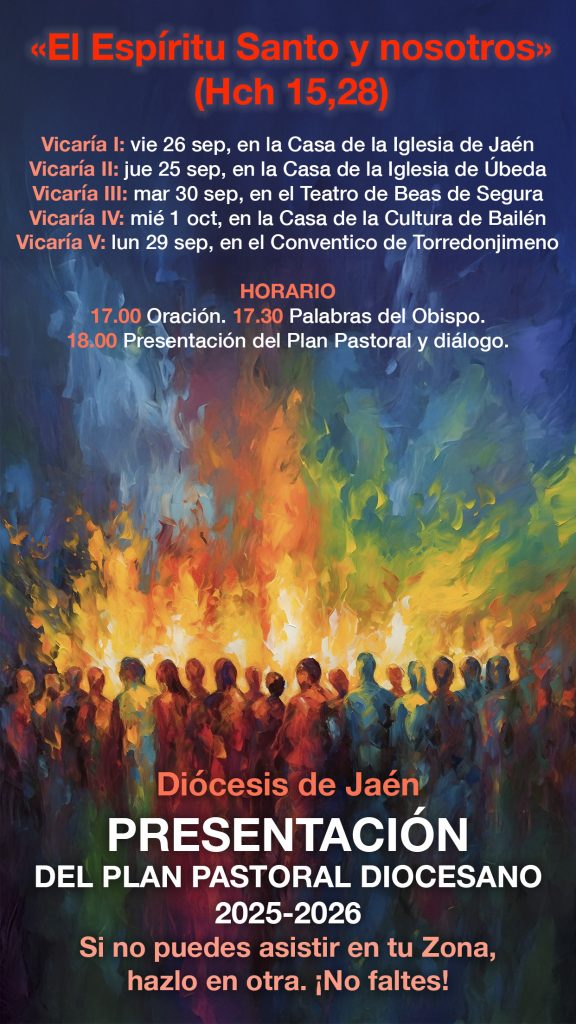 Con el lema «El Espíritu Santo y nosotros» (Hch 15,28), la Diócesis de Jaén convoca a sacerdotes y laicos a la presentación del plan de trabajo para el curso 2025-2026, enmarcado en el Plan Pastoral Diocesano 2023-2027: «Mira, hago nuevas todas las cosas» (Ap 21,5).