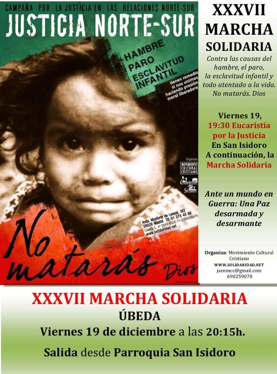 Este viernes 19 de diciembre, el Movimiento Cultural Cristiano llevará a cabo la XXXVII Marcha solidaria con los empobrecidos de la Tierra. Como otros años el acto comenzará con la Eucaristía por la Justicia, en la Parroquia de San Isidoro de Úbeda, a las siete y media de la tarde.